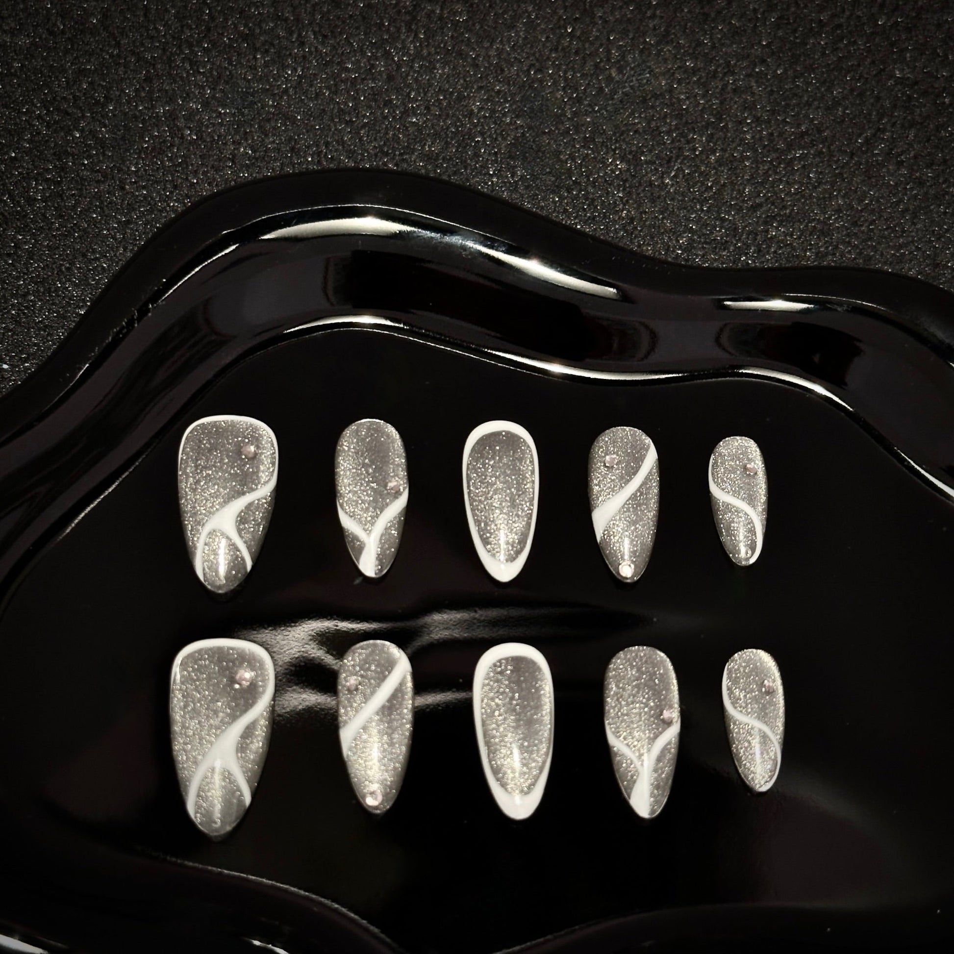 Sleek silver nails adorned with delicate white accents and subtle rhinestone details. These nails are designed to radiate grace and modern charm, ideal for elevating any look effortlessly.