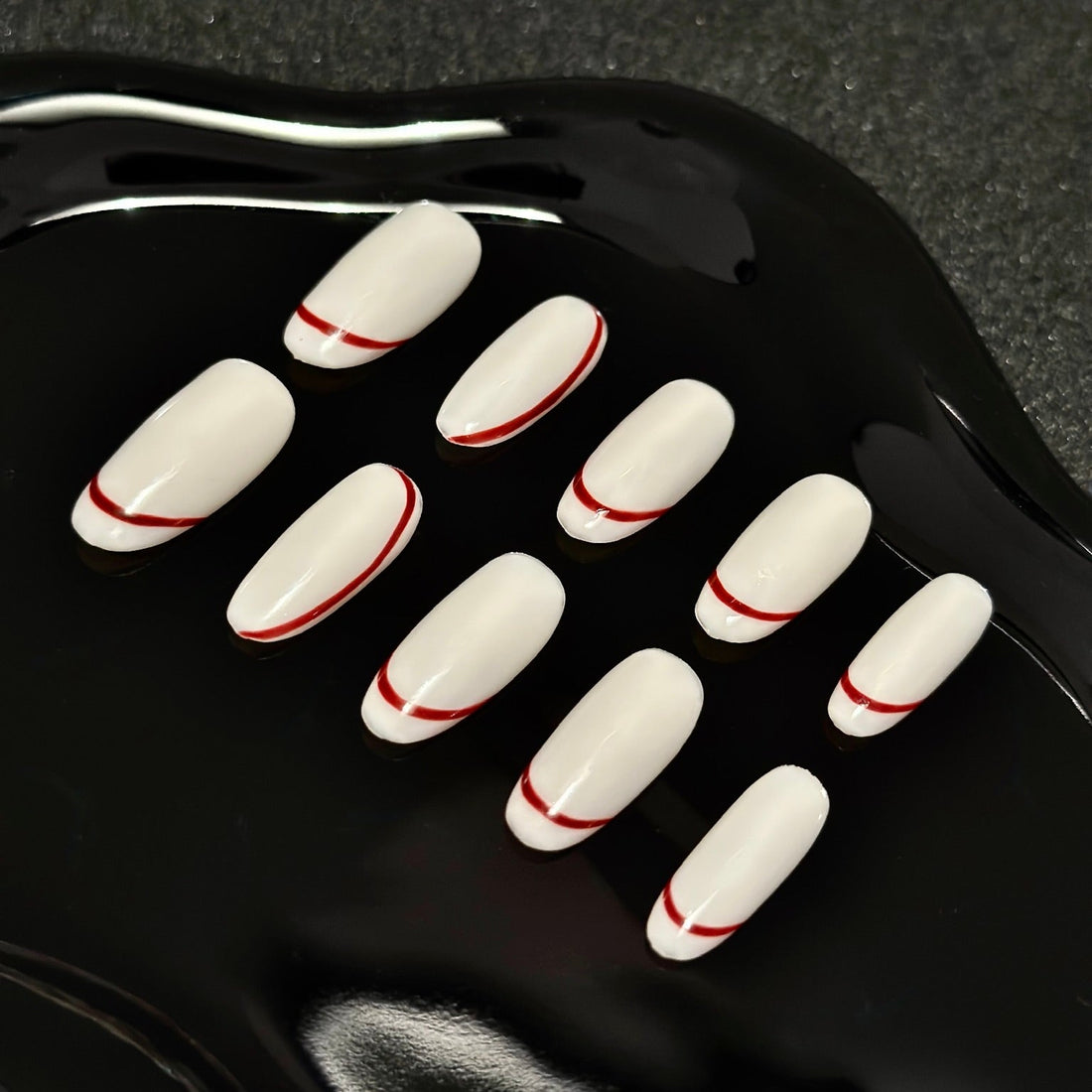 A modern twist on classic French tips. White nails with sleek red accents bring bold...