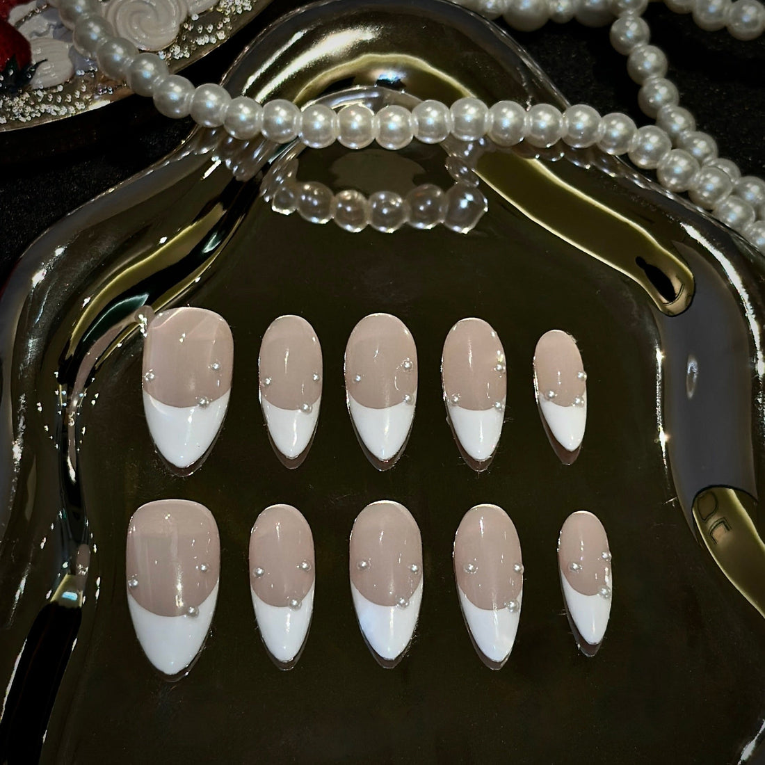 Elevate your style with Pearl Elegance press-on nails. Featuring classic white French tips, subtle nude...