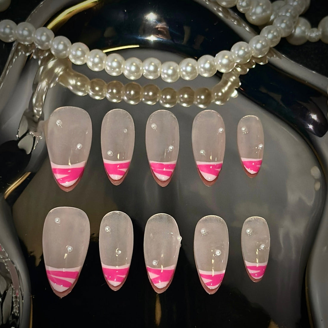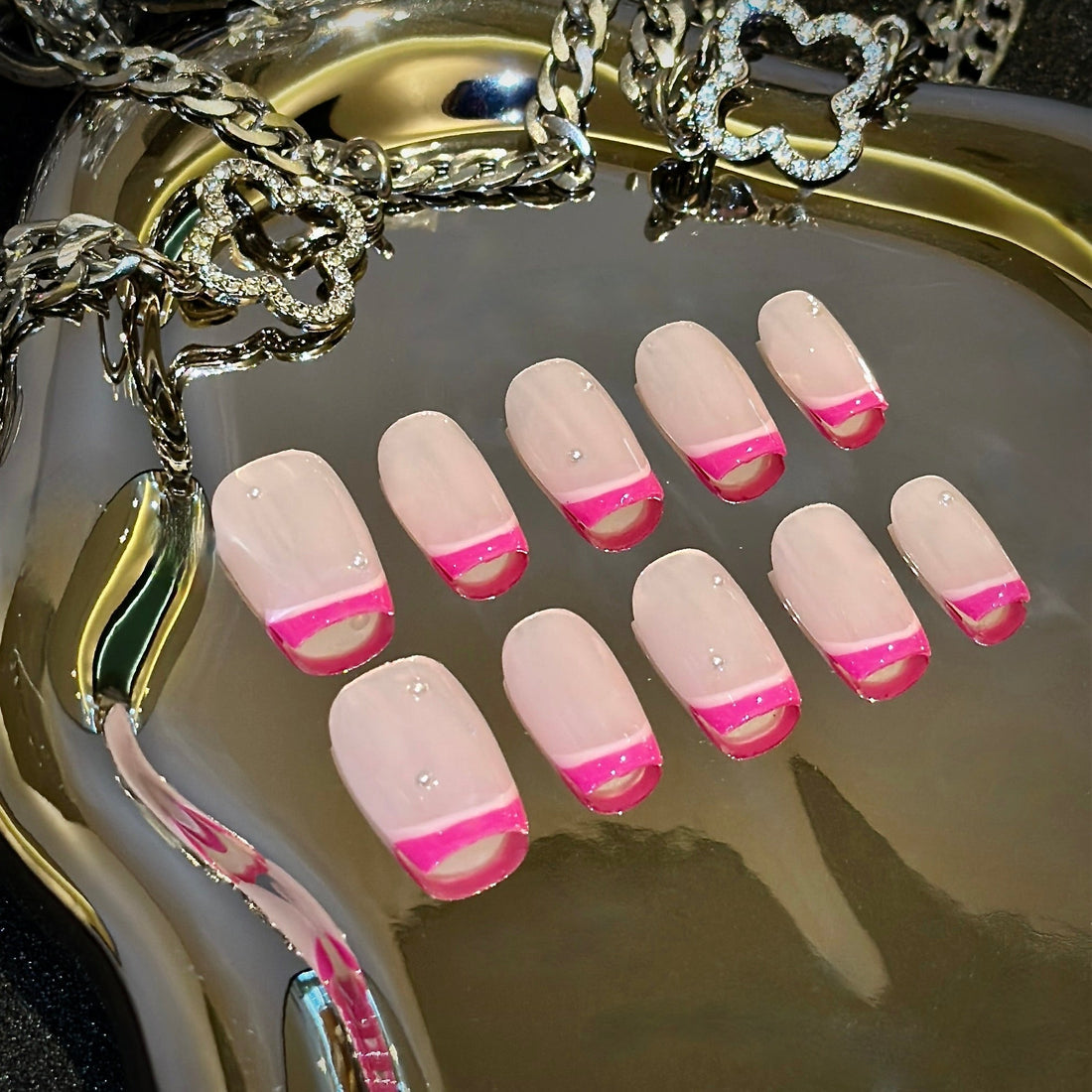 This press-on nail set combines vibrant pink and snow white tones, offering a modern yet...