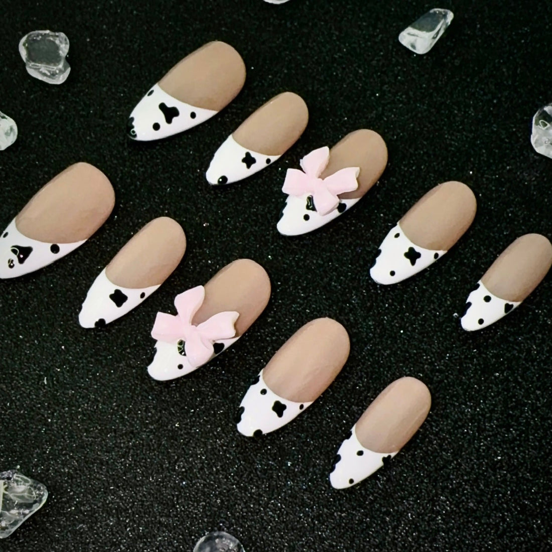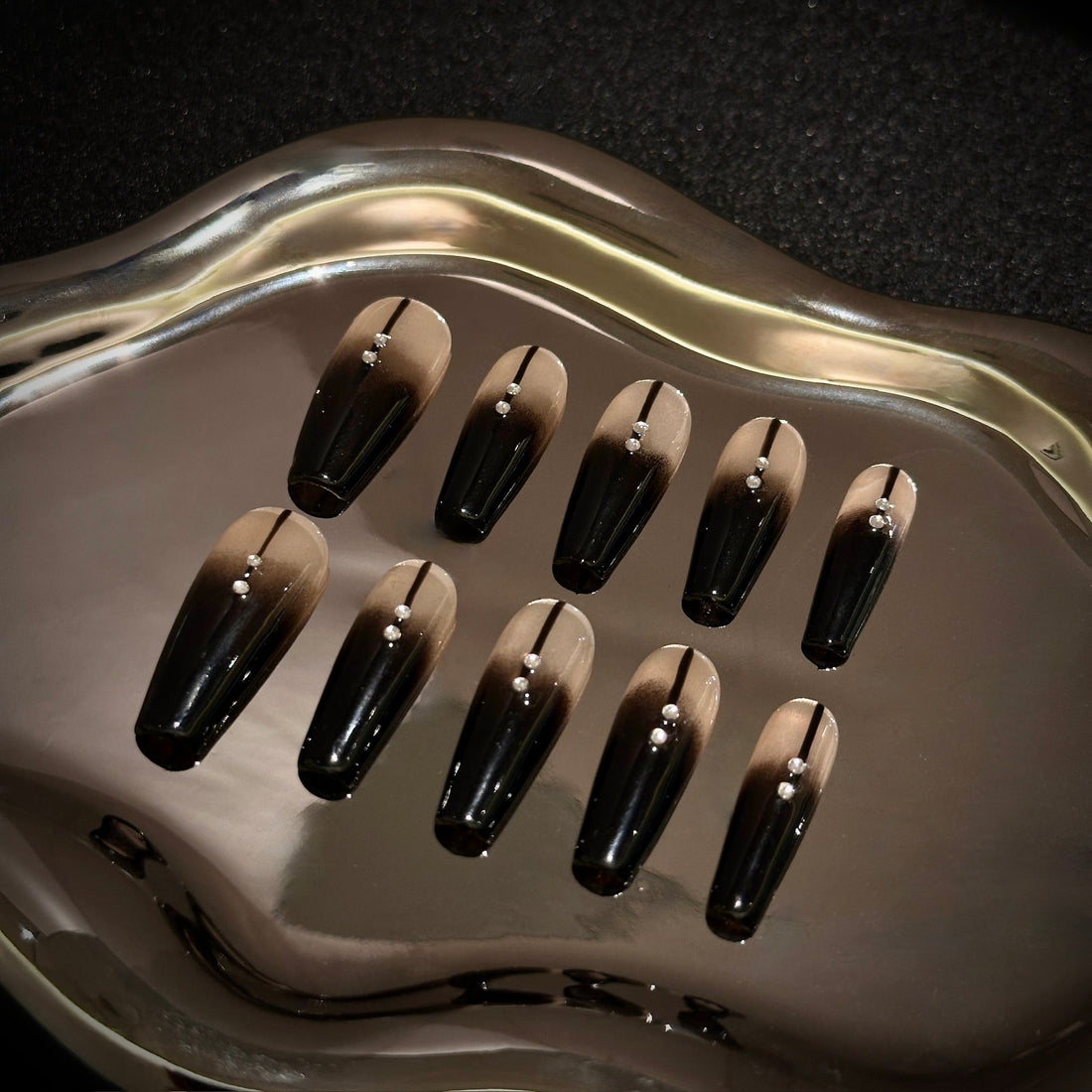 (undersize)This press-on nail set showcases a timeless nude palette accented with a shimmering deep brown...