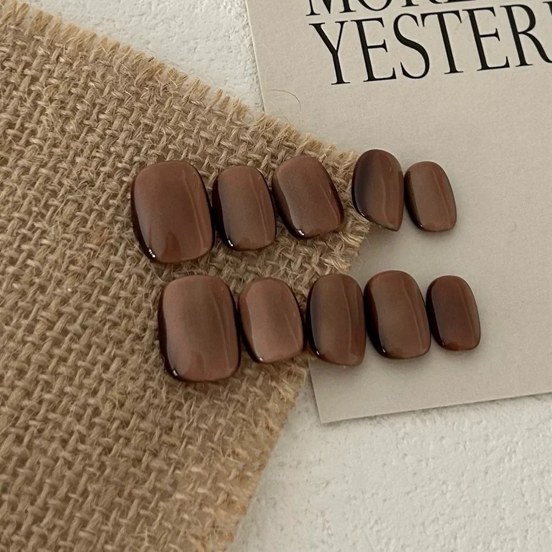 This press-on nail set showcases a deep coffee hue with a silky, glossy finish, exuding...
