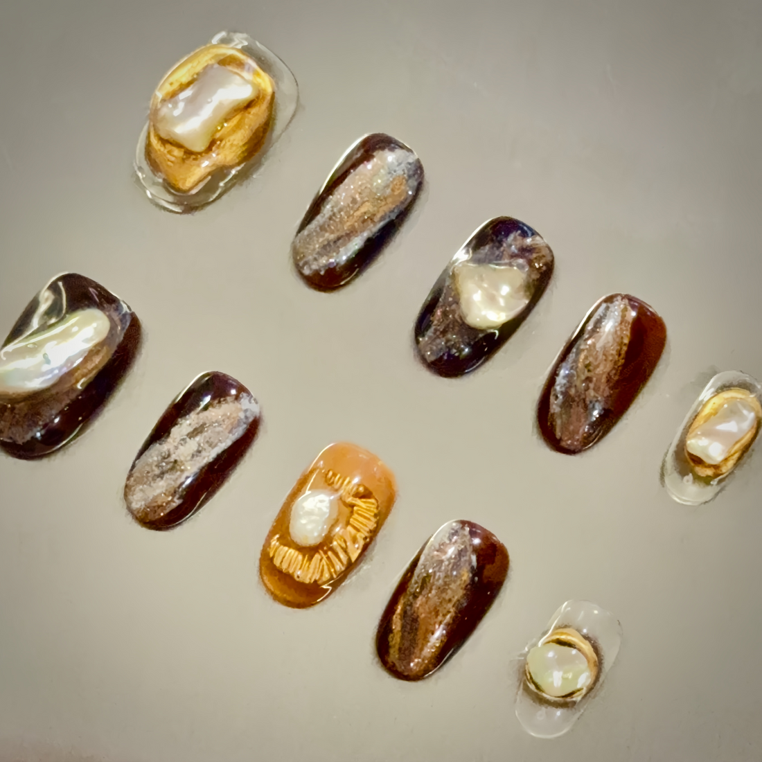 This stunning nail set perfectly blends luxury and artistry, featuring golden marble-inspired designs with 3D...