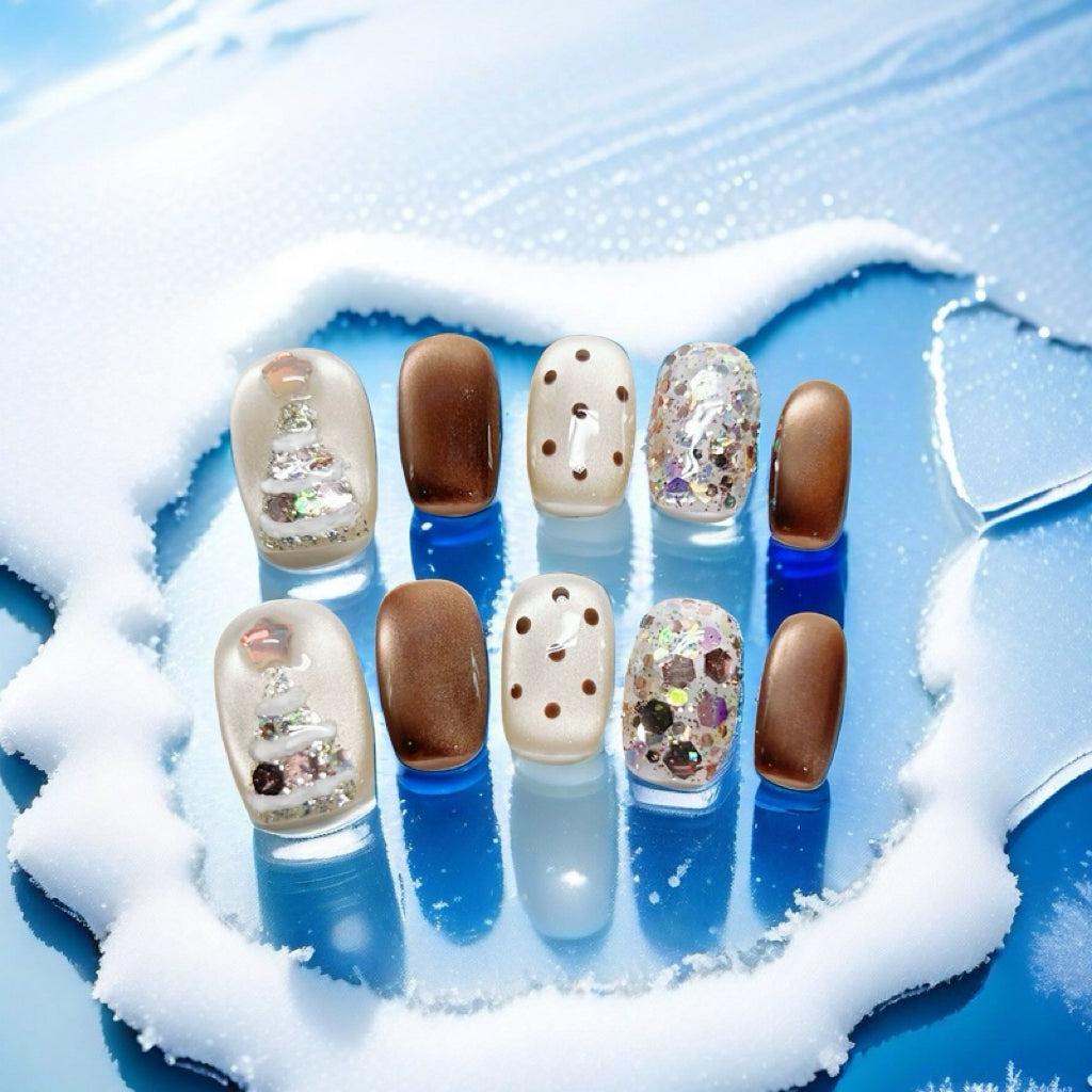 Inspired by a winter wonderland, this press-on nail set combines frosty snowflake elements, warm coffee...