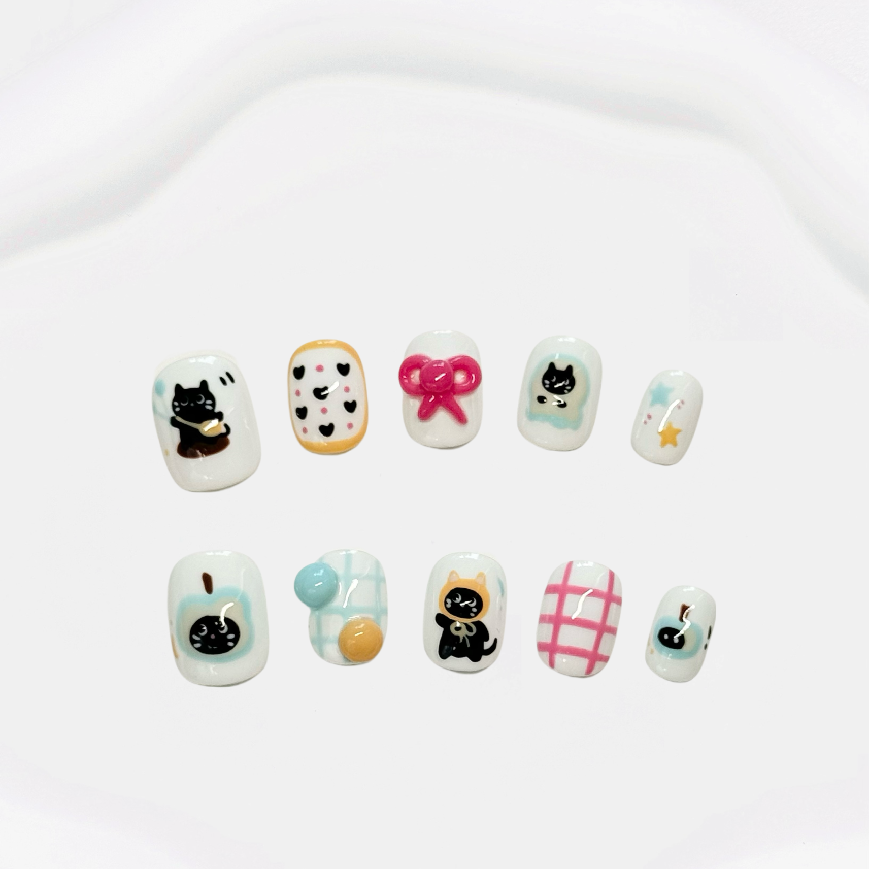 This press-on nail set features playful black cat motifs paired with hearts, bows, and plaid designs, creating a charming blend of fun and sweetness. The fresh blue and white tones, accented with soft pink, deliver a cheerful look perfect for everyday wear or adding a unique touch to your style. Made with eco-friendly, reusable materials, it’s the perfect fusion of sustainability and fashion.