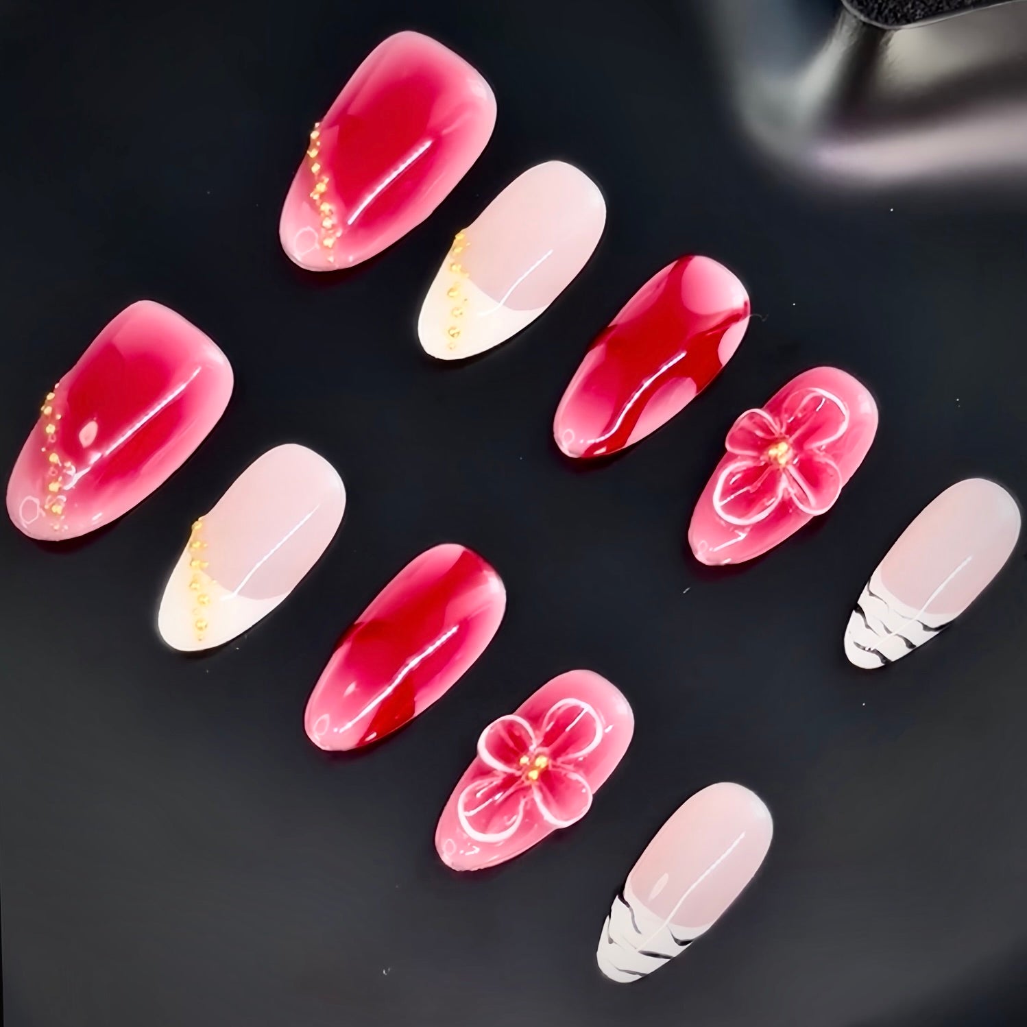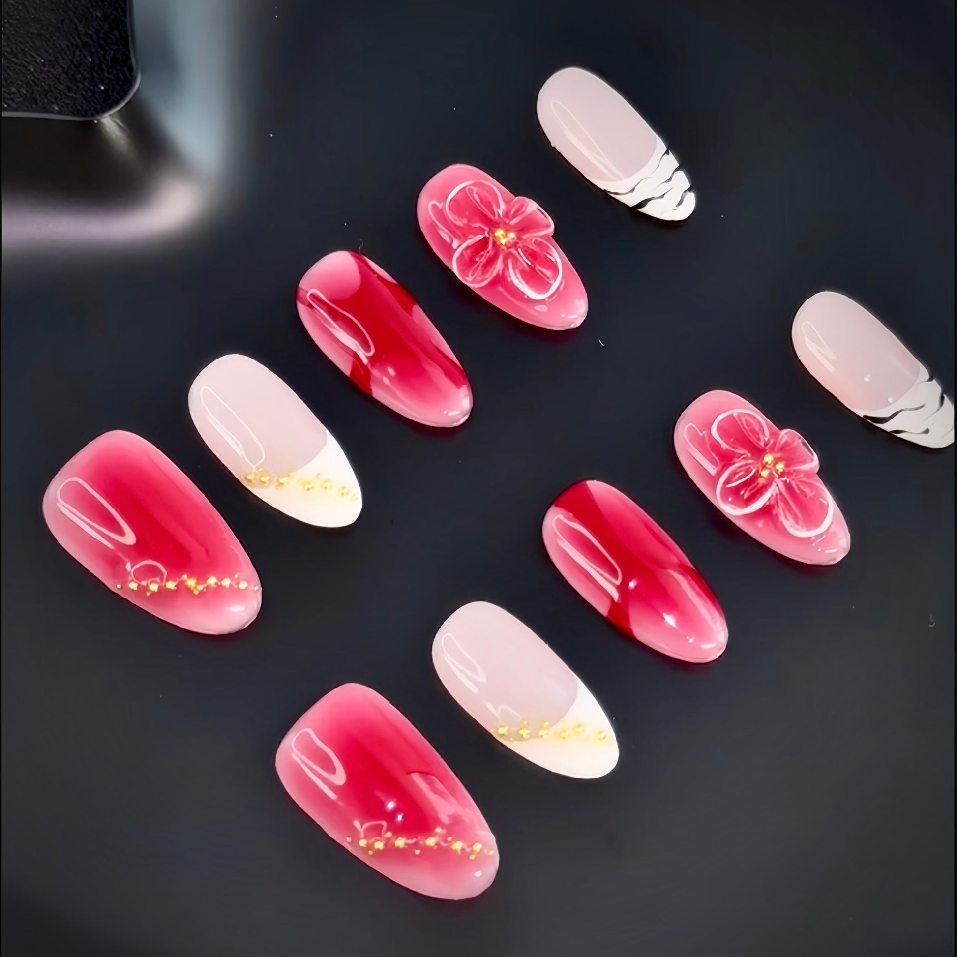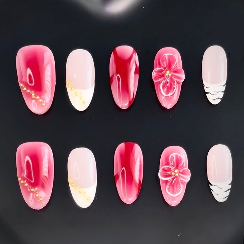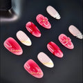 A timeless fusion of deep scarlet and soft blush tones, this handcrafted press-on nail set exudes elegance and passion. Delicate floral 3D accents, golden embellishments, and gradient details create a sophisticated yet romantic aesthetic. Perfect for special occasions or adding a touch of luxury to your everyday style.