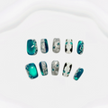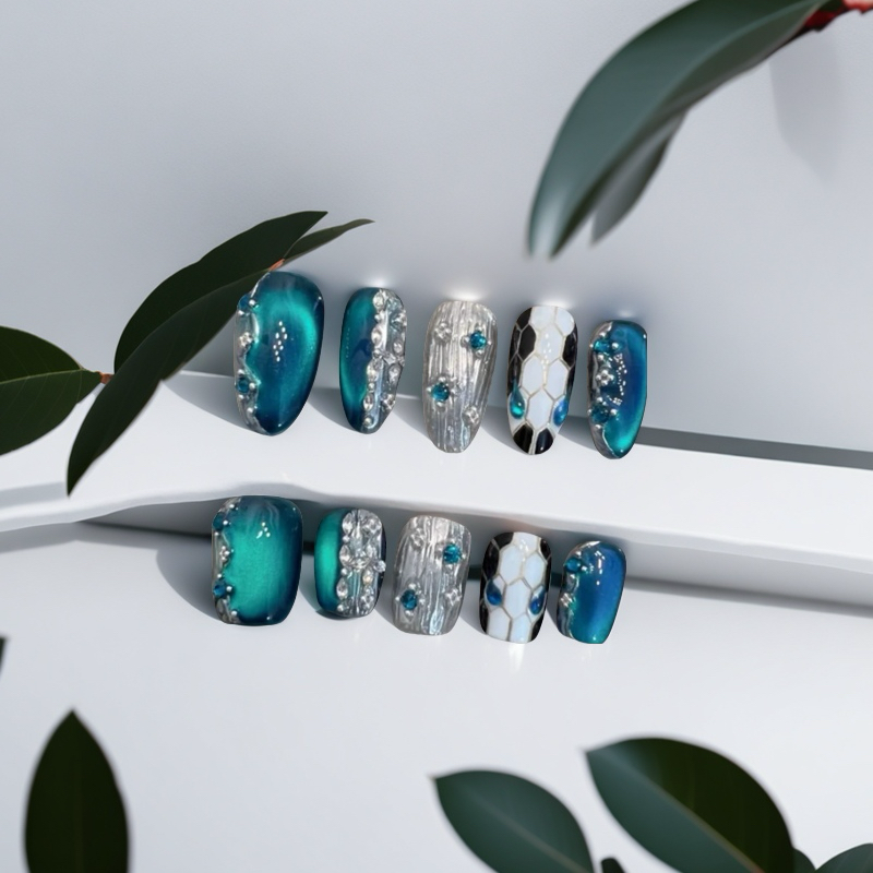 The Blue - silver Fantasy Nail Art features an enchanting teal color as the main tone, displaying a deep and mysterious charm like the ocean. Silver elements are incorporated into the nail art, with some presenting a metallic wire - drawing texture and others resembling shiny silver foil, adding a sense of futurism and fashion. Some nails are also adorned with teal rhinestones, like stars in the night sky, dazzling and brilliant. The overall design is full of a dreamy and luxurious atmosphere, suitable for women who pursue individuality and fashion. Whether at parties or in daily outfits, it can make your fingertips the center of attention.