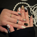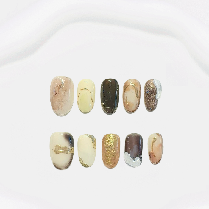 Inspired by natural marble textures, this press-on nail set features a harmonious blend of gold, brown, and creamy white tones. Each nail is designed with unique flowing patterns and subtle metallic sheen, creating a timeless and elegant look. Perfect for any occasion, these eco-friendly, reusable nails combine sophistication with sustainability.