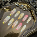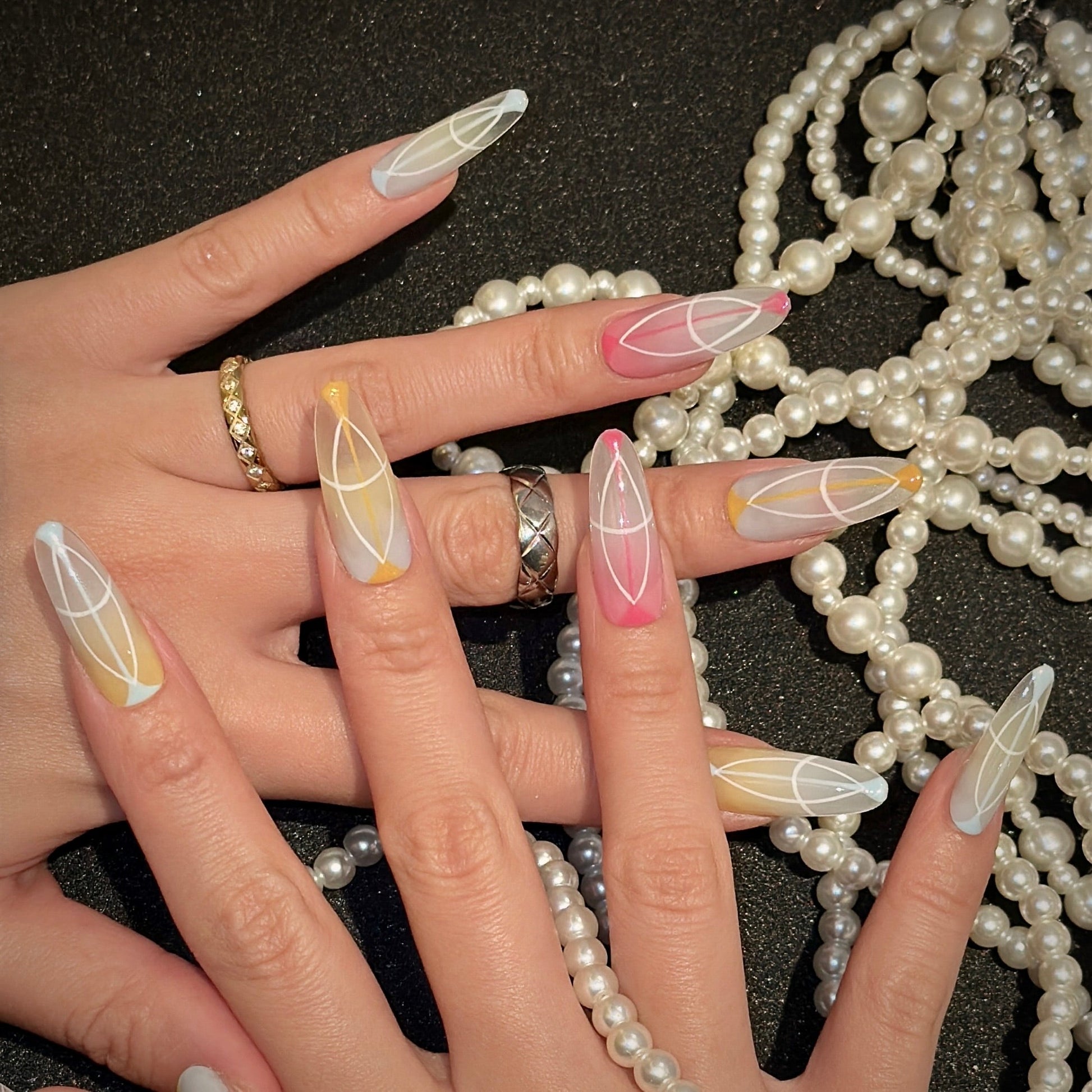 “Prism Glow” captures the essence of playful sophistication with its pastel gradient designs framed by clean white geometric lines. This vibrant press-on nail set exudes elegance with a touch of modern flair, perfect for any occasion.