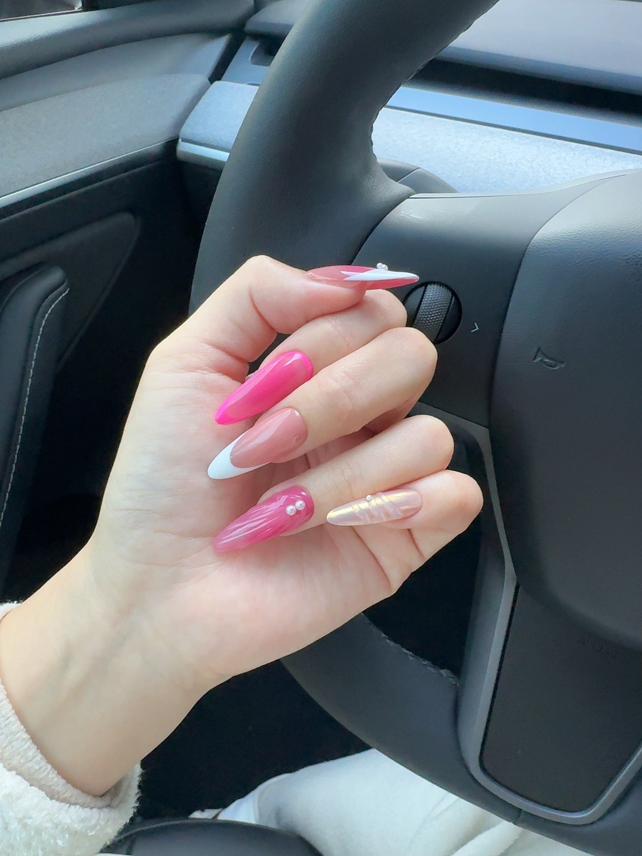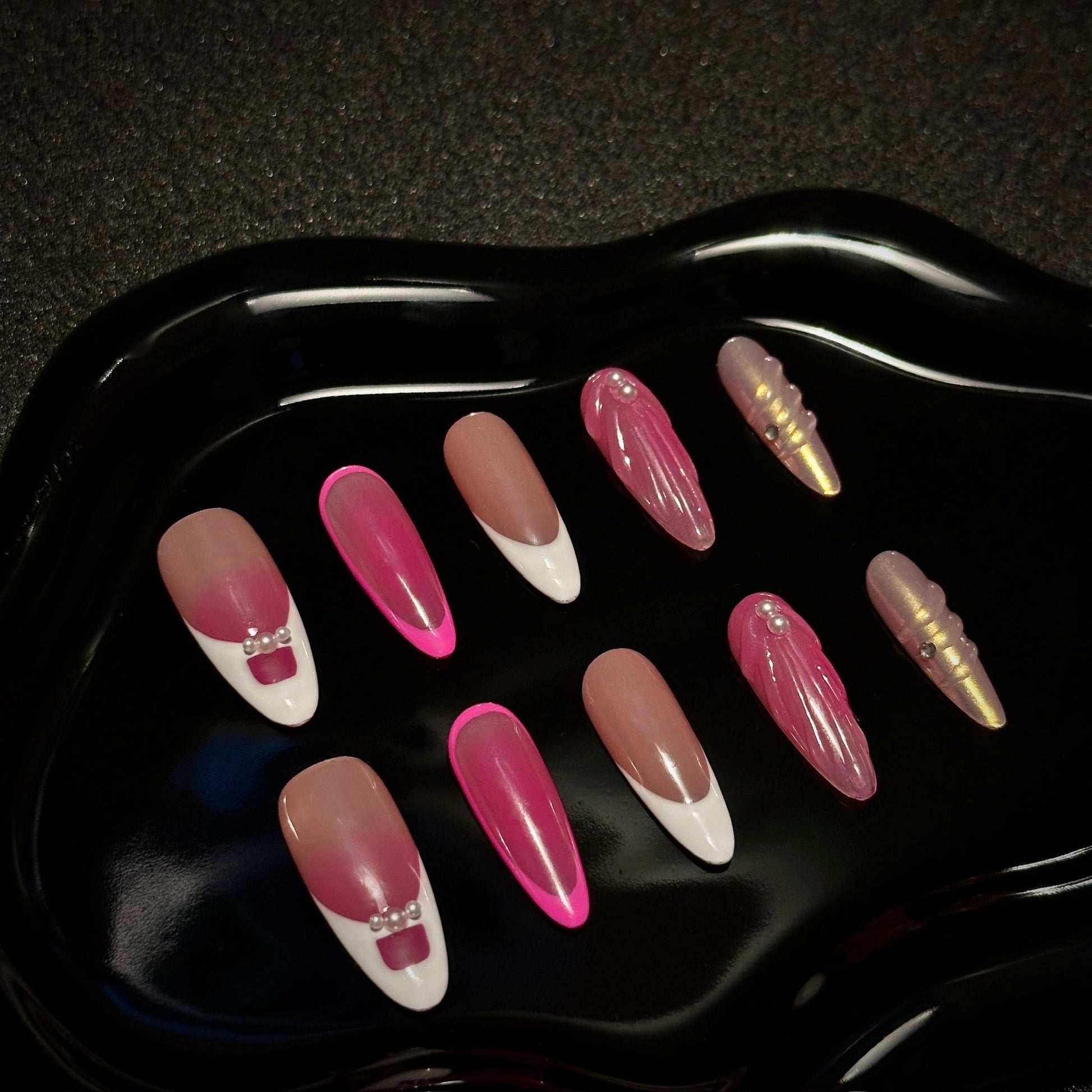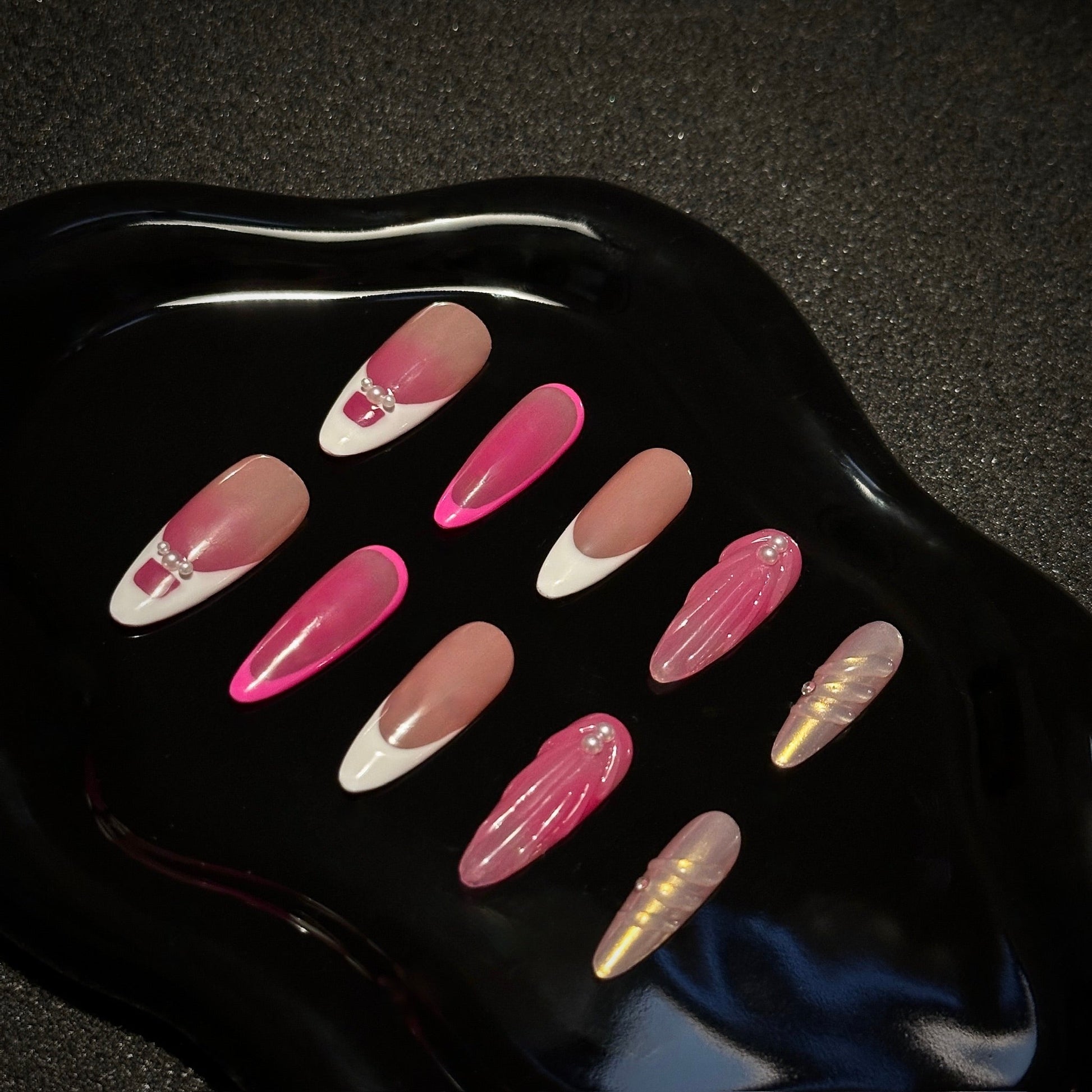 A stunning blend of pink, pearl, and French tip accents adorned with delicate rhinestones. Perfect for creating a playful yet sophisticated look. Designed to turn heads and complement every occasion.