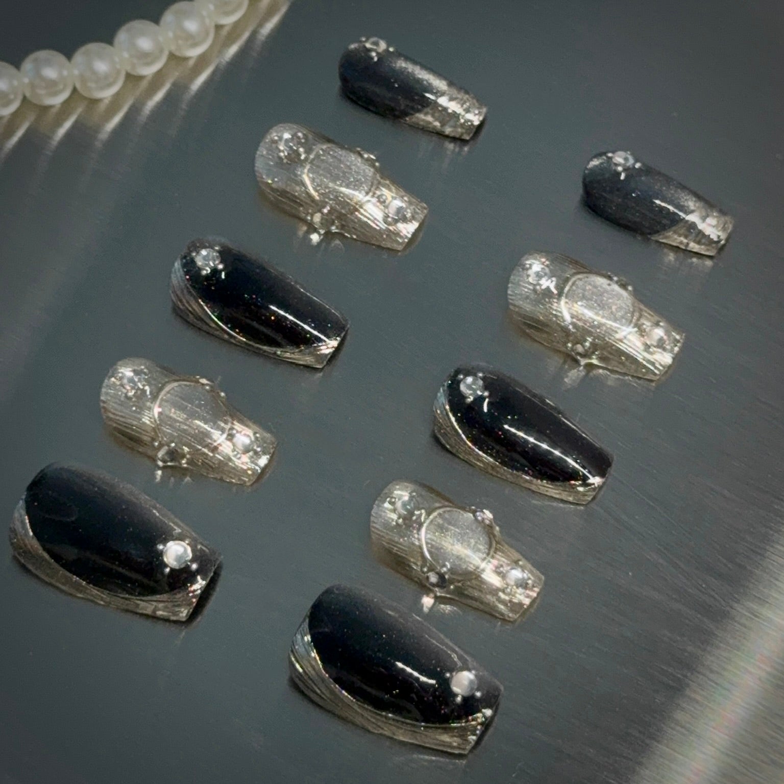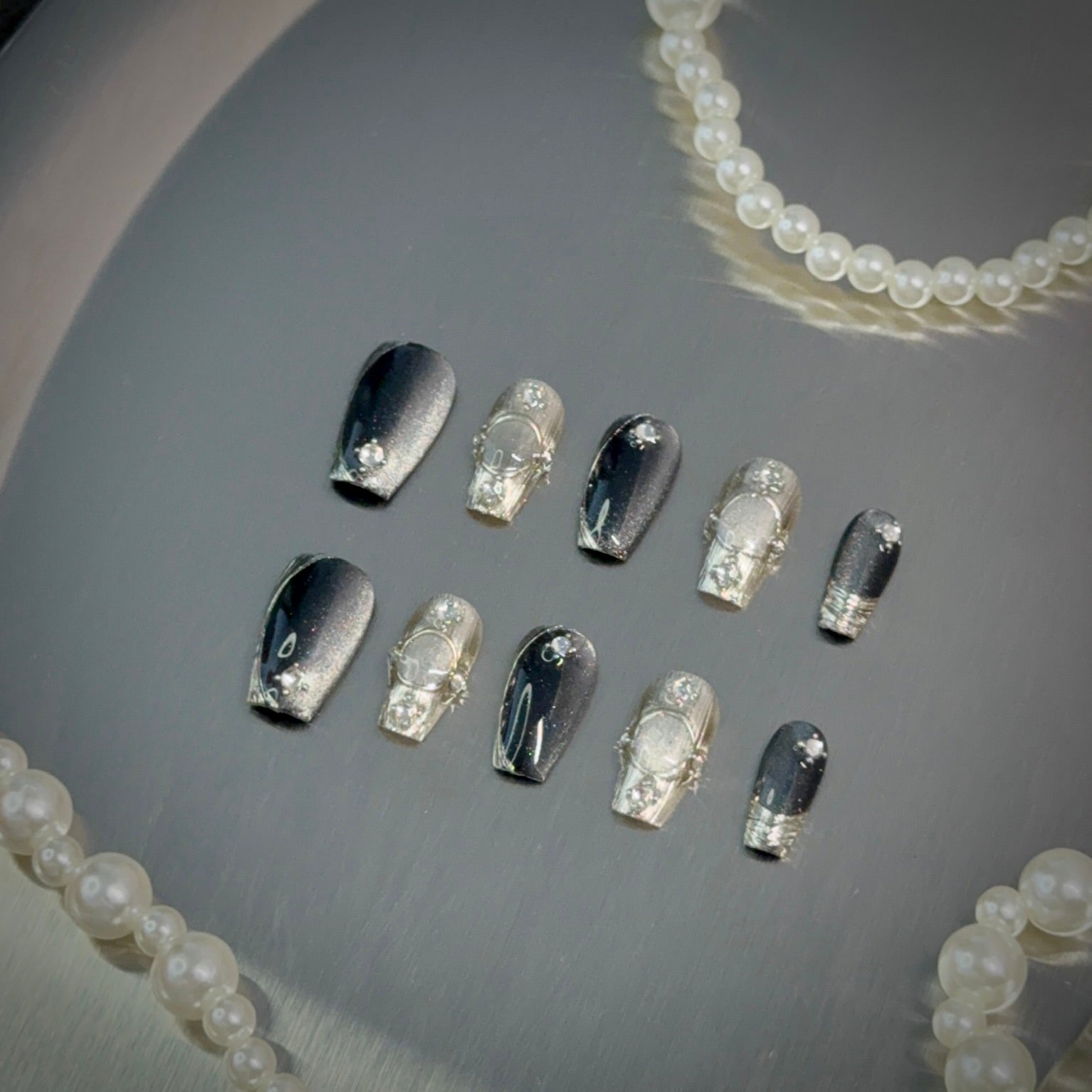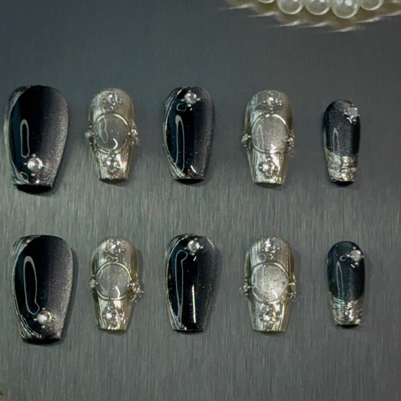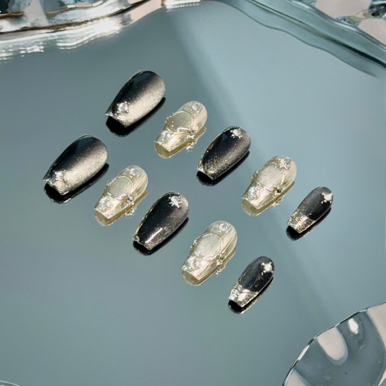 Embrace the artistry of elegance with our Bucellati Chic Cat's Eye Nail Art Set! This exquisite collection combines the mesmerizing cat-eye effect with the refined brushed texture inspired by Italian Bucellati craftsmanship. Each nail features a stunning interplay of deep black and shimmering translucent tones, adorned with intricate details that evoke a sense of luxury and sophistication. Perfect for art lovers and those who appreciate unique style, these press-on nails are easy to apply, making them ideal for any glamorous occasion.