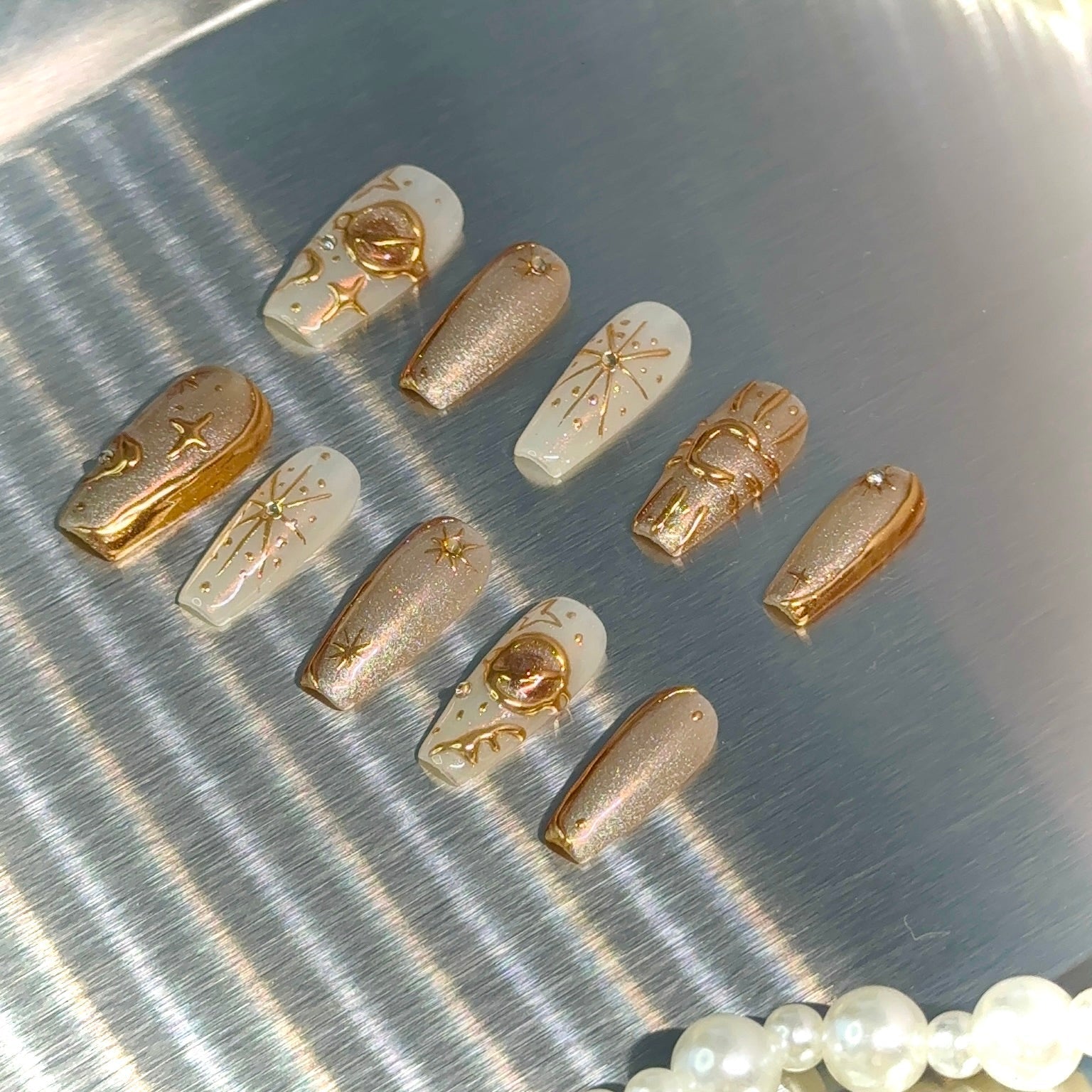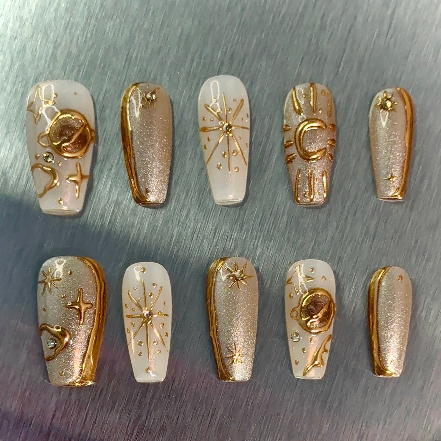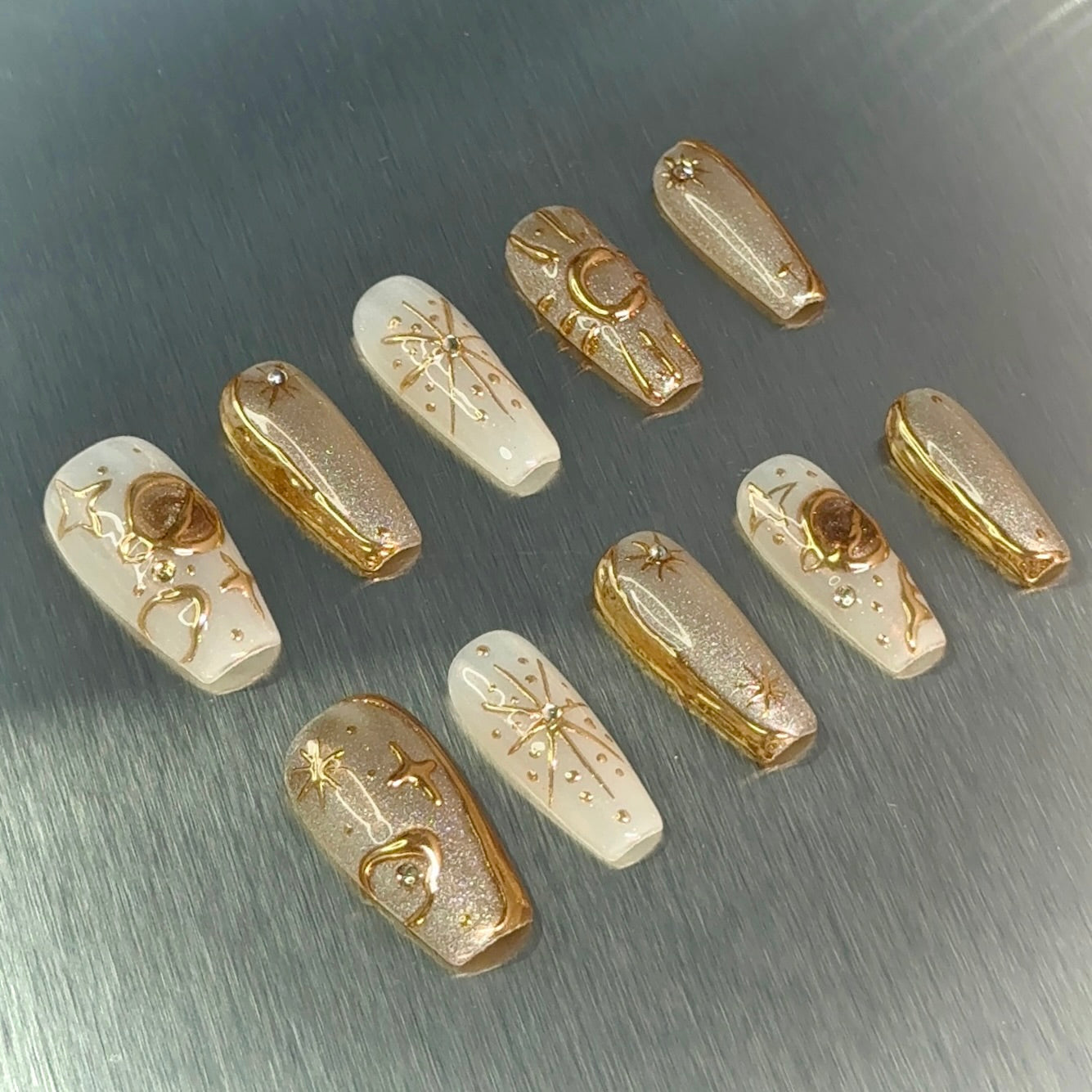 Illuminate your style with our Celestial Glow Nail Art Set! This stunning collection features a blend of soft white and shimmering gold accents, inspired by the beauty of the night sky. Each nail is adorned with intricate celestial designs, including stars, moons, and planets, bringing a touch of cosmic elegance to your look. Perfect for special occasions or everyday wear, these press-on nails are easy to apply, allowing you to express your unique personality effortlessly.
