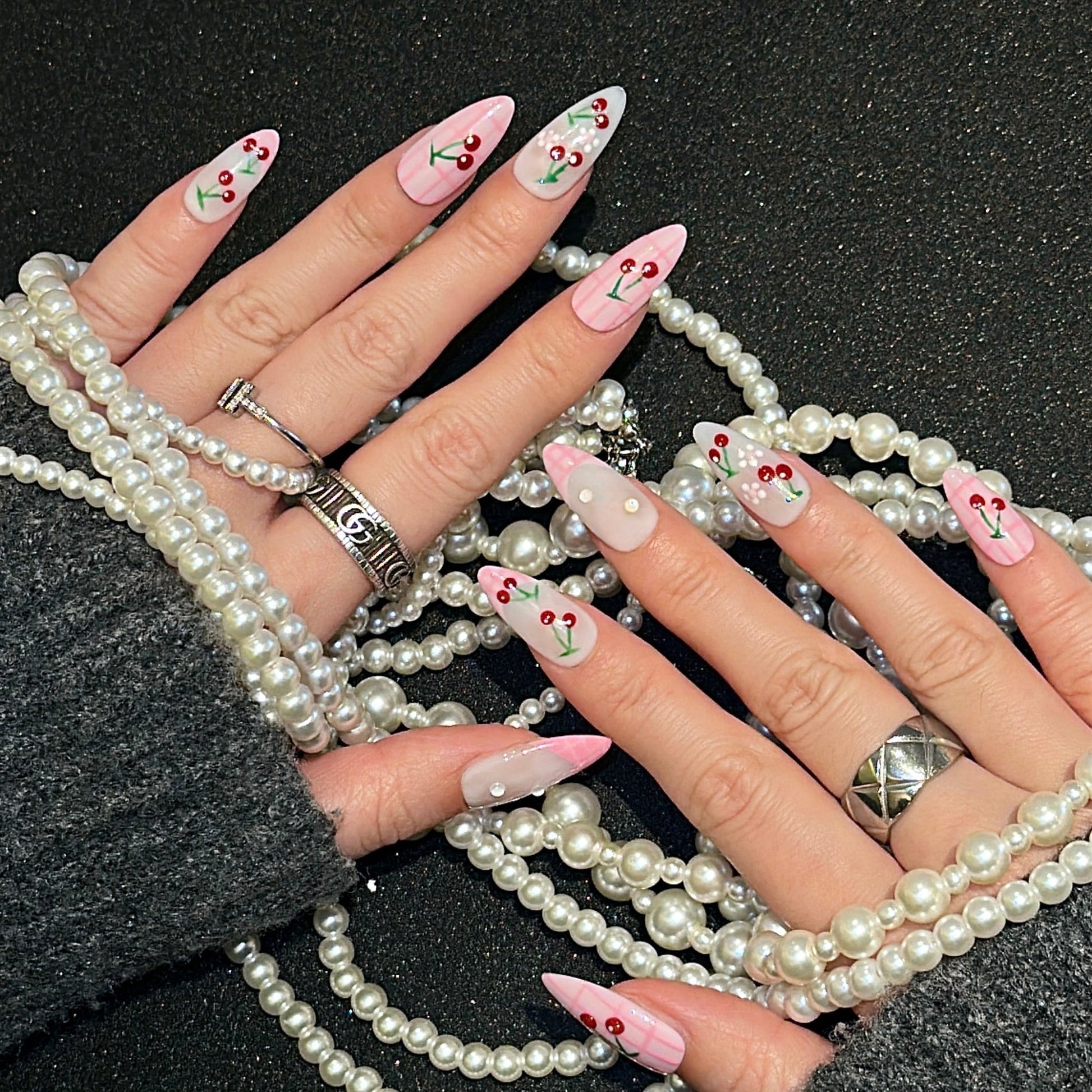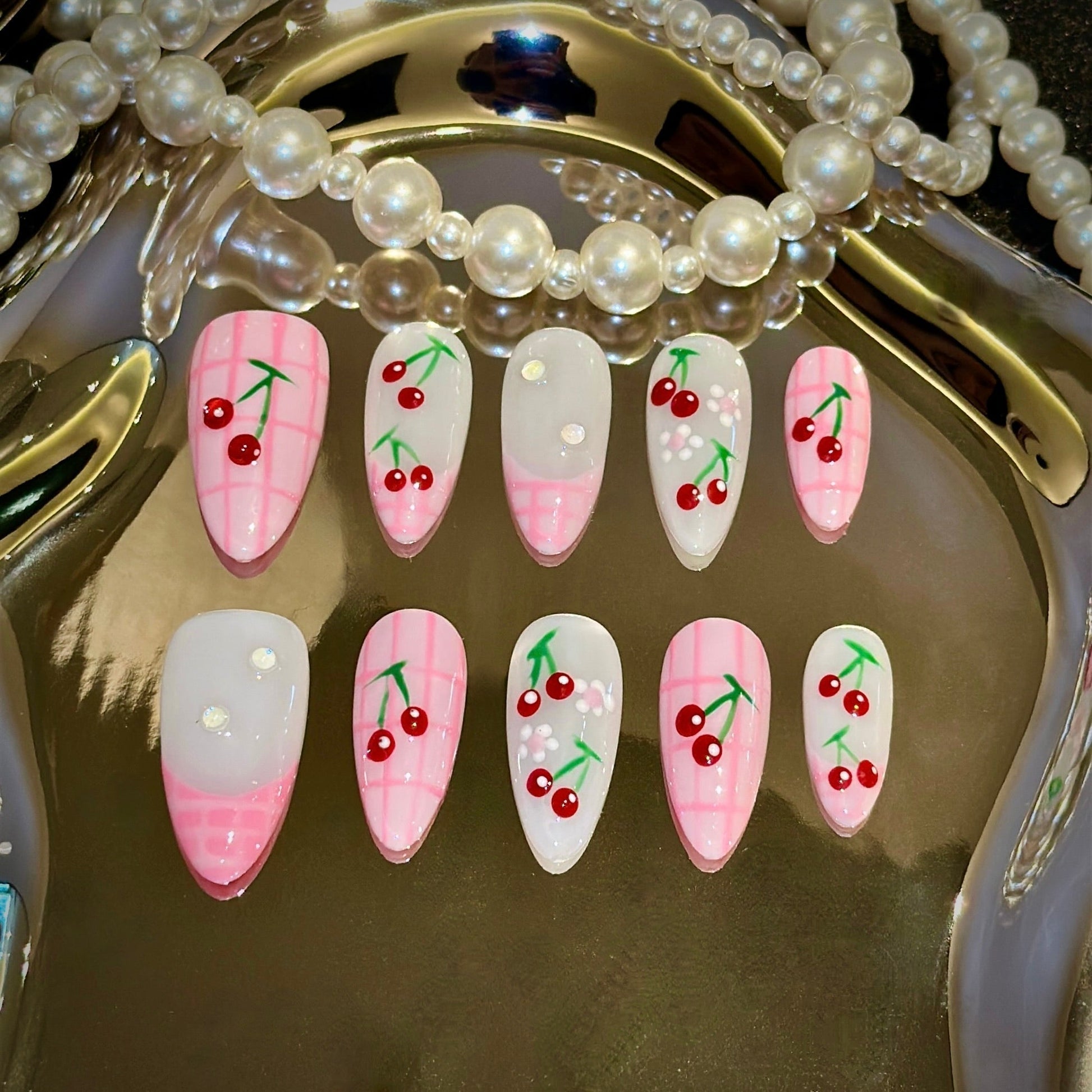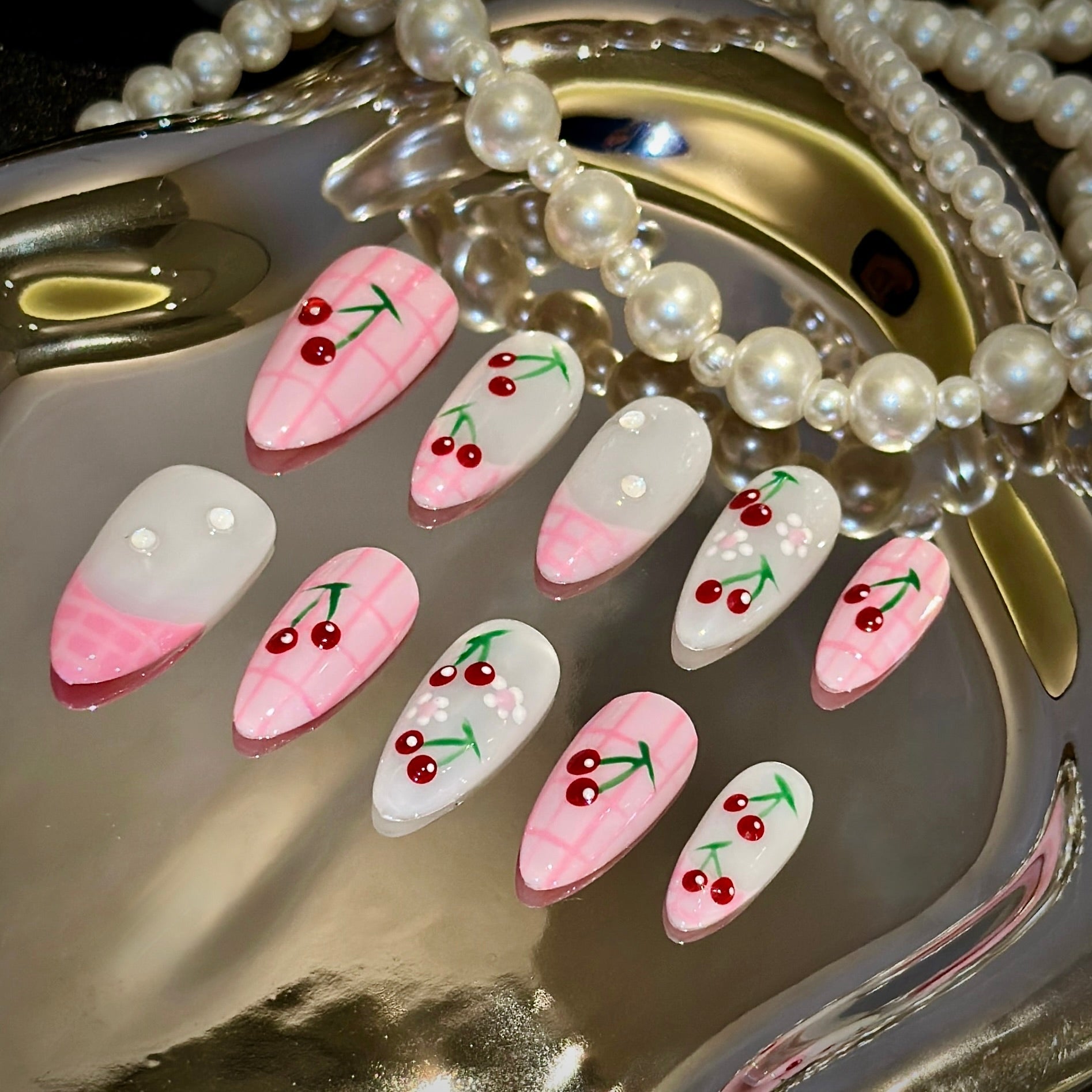 Celebrate the sweetness of summer with Cherry Picnic press-on nails. Featuring charming cherry designs paired with pastel pink plaid patterns and delicate pearl accents, these nails radiate playful elegance perfect for any occasion.