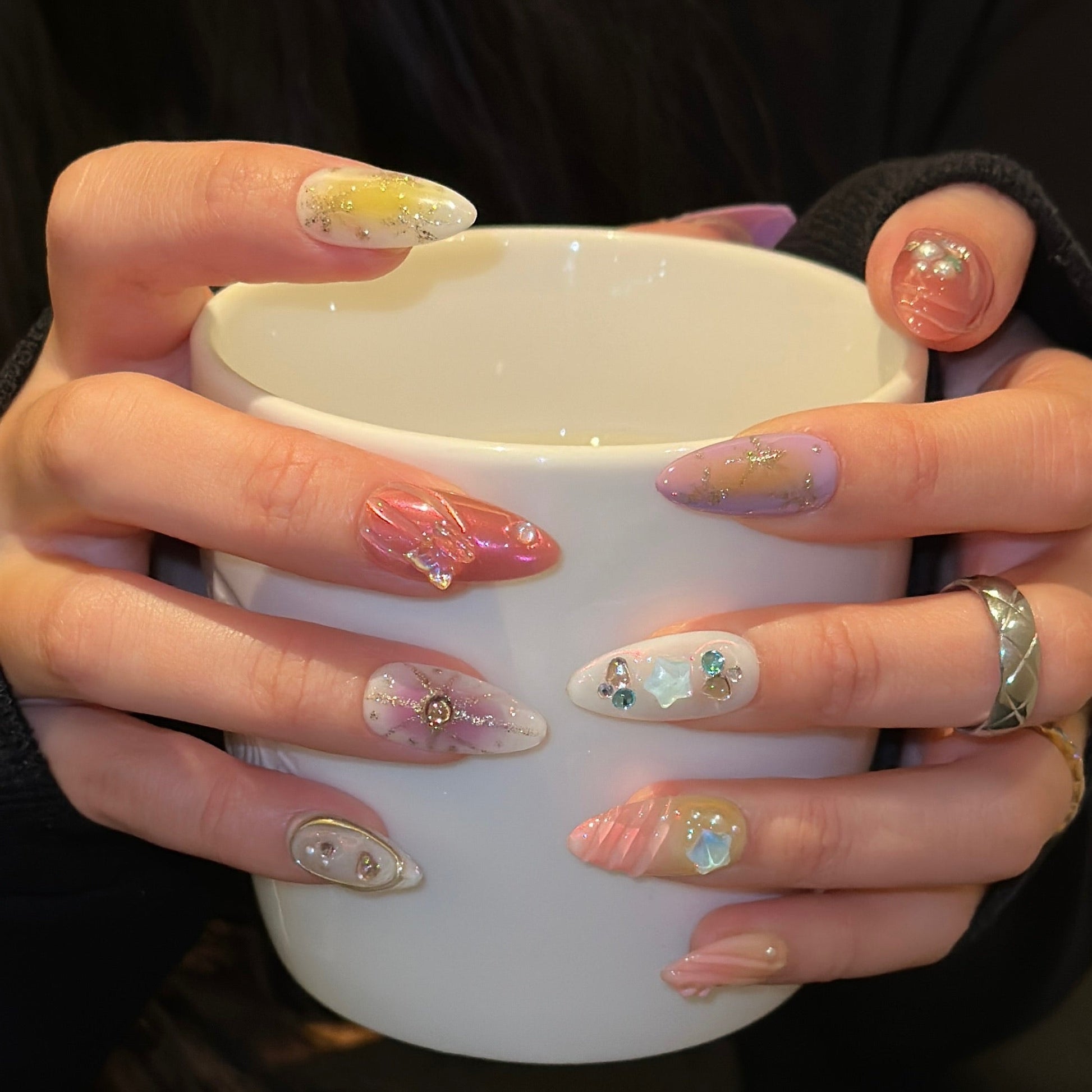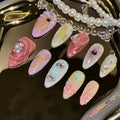 The Colorful Galaxy Nail Art is like the twinkling stars in the night sky, colorful and full of a dreamy feeling. Each nail has a unique gradient color, ranging from pink, purple to light blue, as gorgeous as a rainbow. The nails are also decorated with various shining rhinestones and delicate crystal elements, like stars dotted in the galaxy, shining brightly. This nail art design is suitable for fashionable occasions such as parties and dinner parties, allowing your fingertips to shine with the bright light like the universe galaxy.