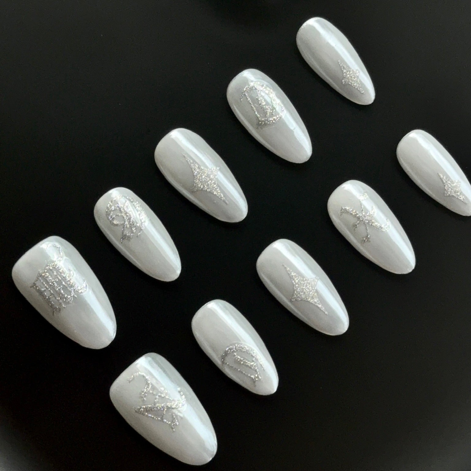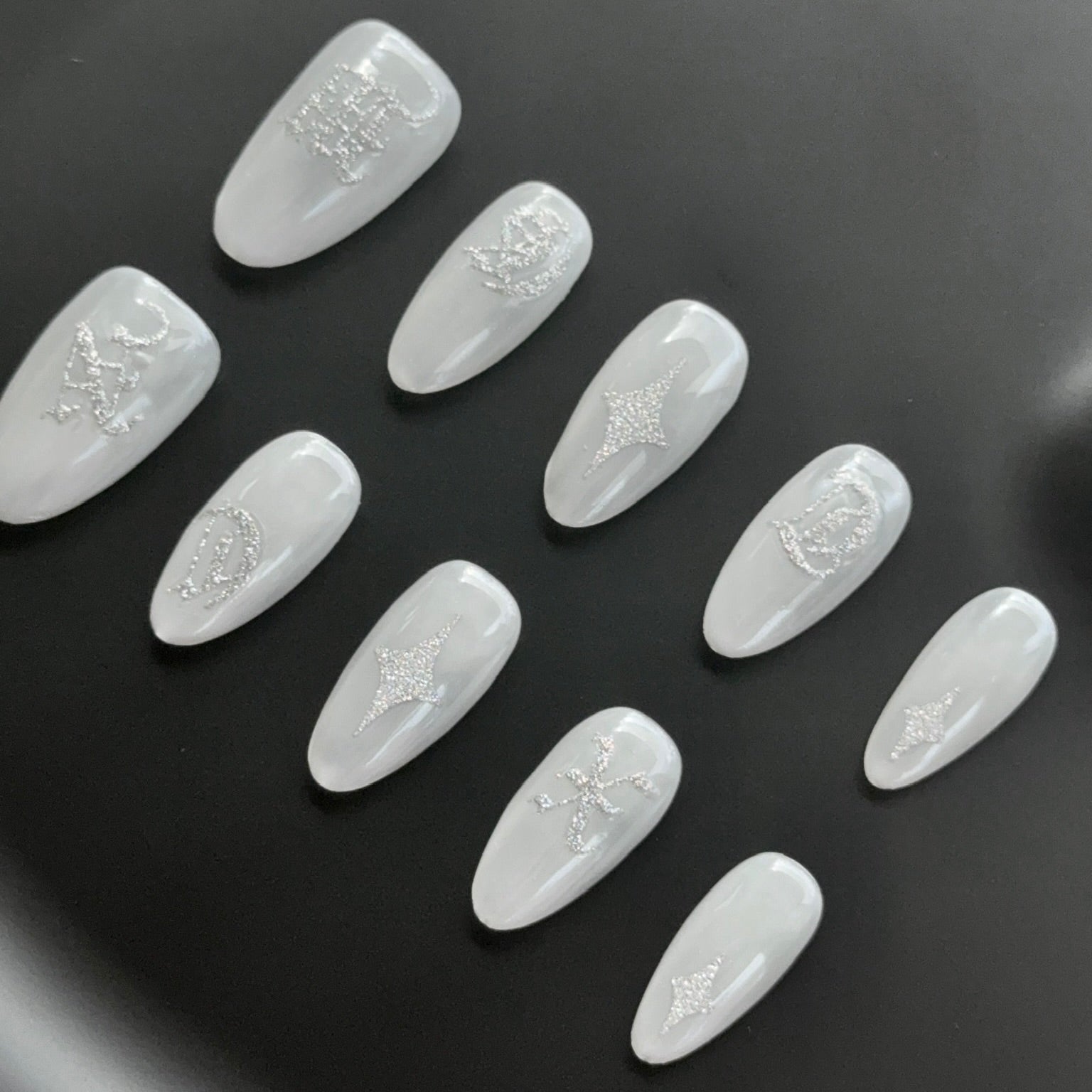 Illuminate your style with our Cosmic Glow Nail Art Set! This stunning collection features a chic light gray base adorned with radiant silver accents, capturing the essence of a celestial night sky. Each nail showcases unique cosmic designs, including stars and mystical symbols, perfect for adding a touch of elegance and intrigue to any look. Whether for a special occasion or to elevate your everyday style, these easy-to-apply press-on nails are a stellar choice!