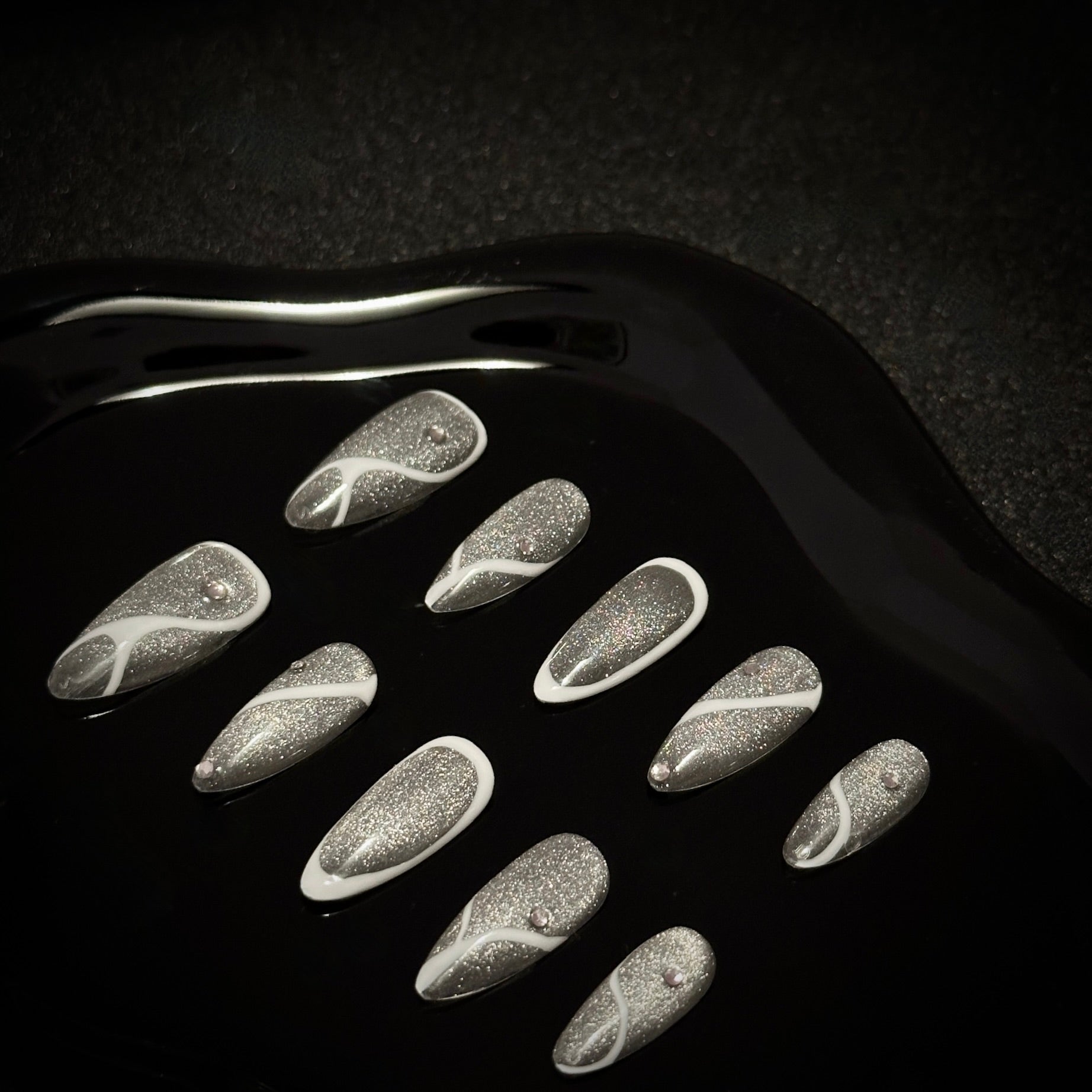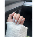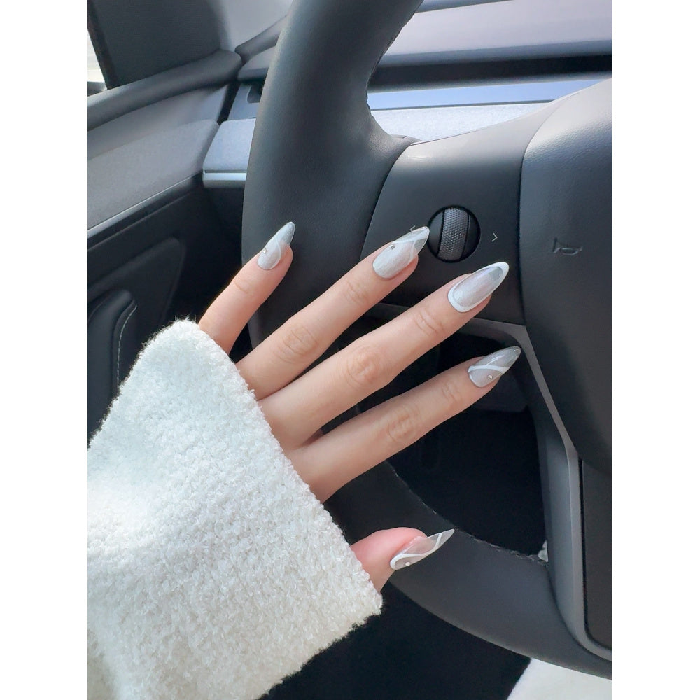 Sleek silver nails adorned with delicate white accents and subtle rhinestone details. These nails are designed to radiate grace and modern charm, ideal for elevating any look effortlessly.