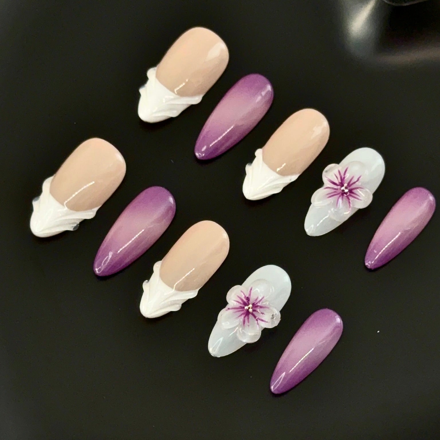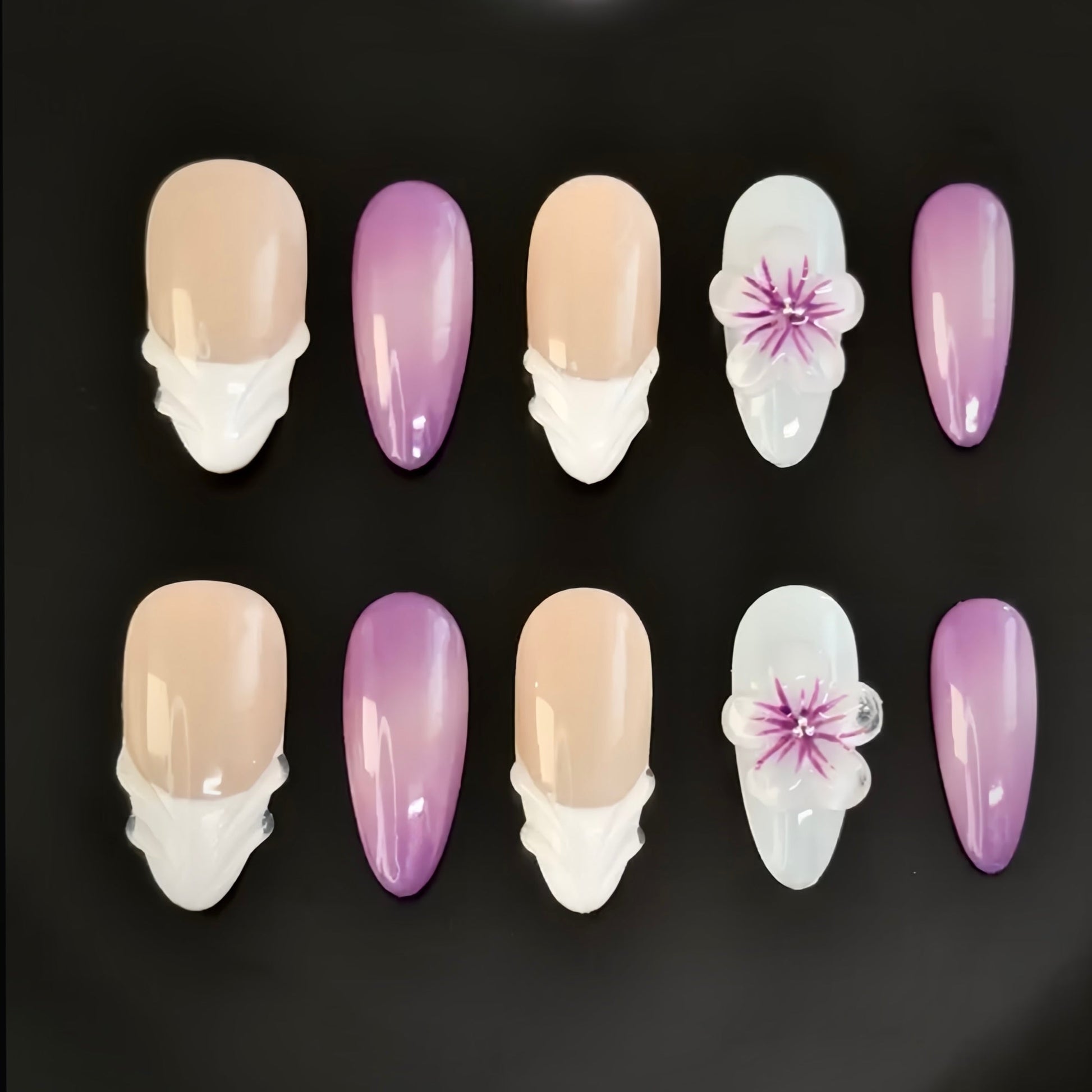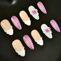 Inspired by delicate floral artistry, this handcrafted press-on nail set blends soft beige, ethereal white accents, and a graceful gradient of violet hues. The intricate 3D flower details add a touch of elegance, making it perfect for those who love timeless beauty with a modern twist.